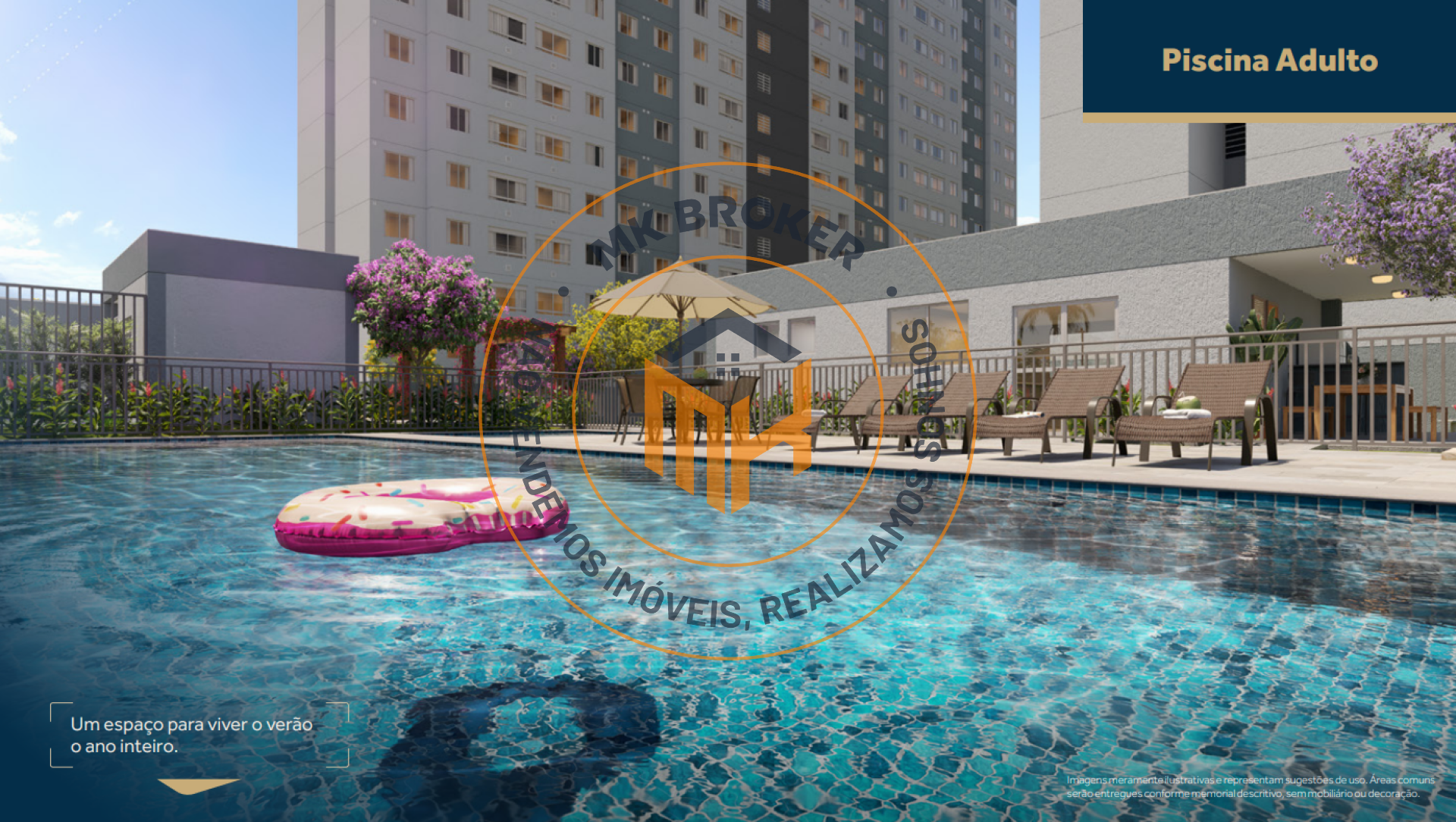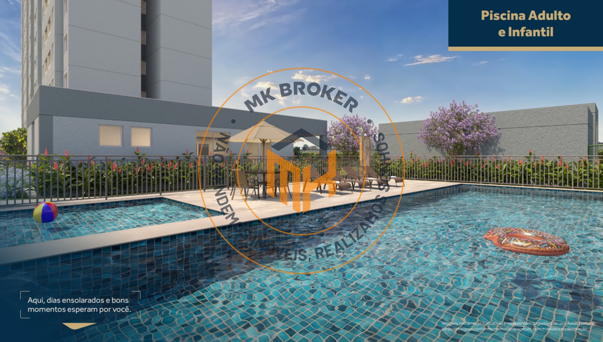 Complexo Aquático: Piscina adulto e infantil com deck e espaço ducha.