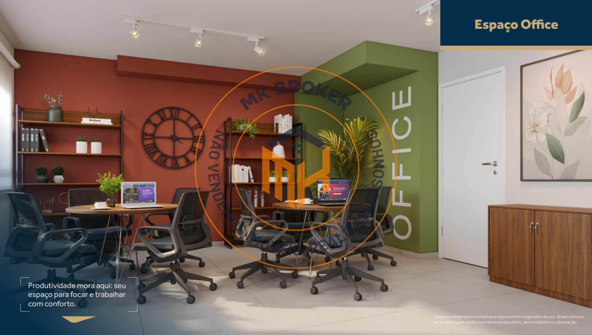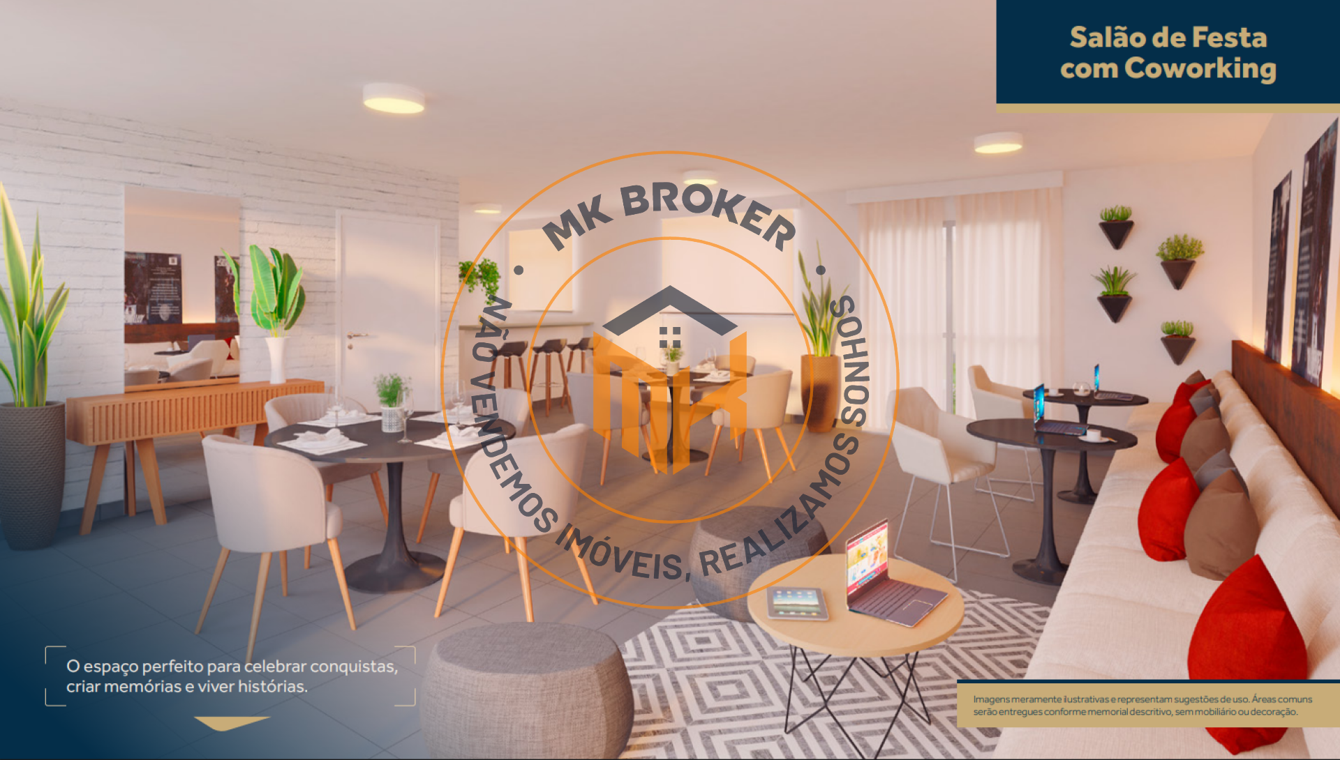 Social e Gourmet: Salão de festas com coworking, churrasqueira gourmet, praça de chegada e praça dos sabores.